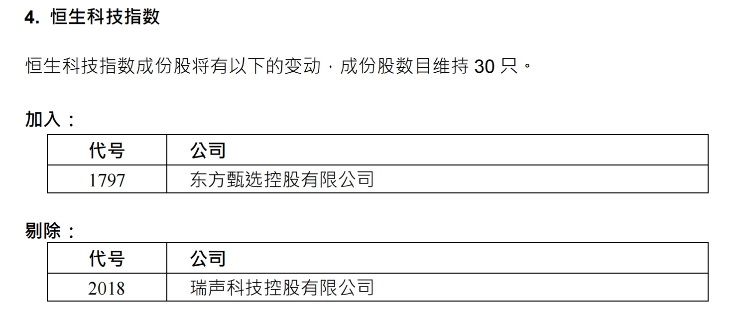 东方甄选(01797)将被纳入恒生科技指数成份股。成份股数目维持30只。