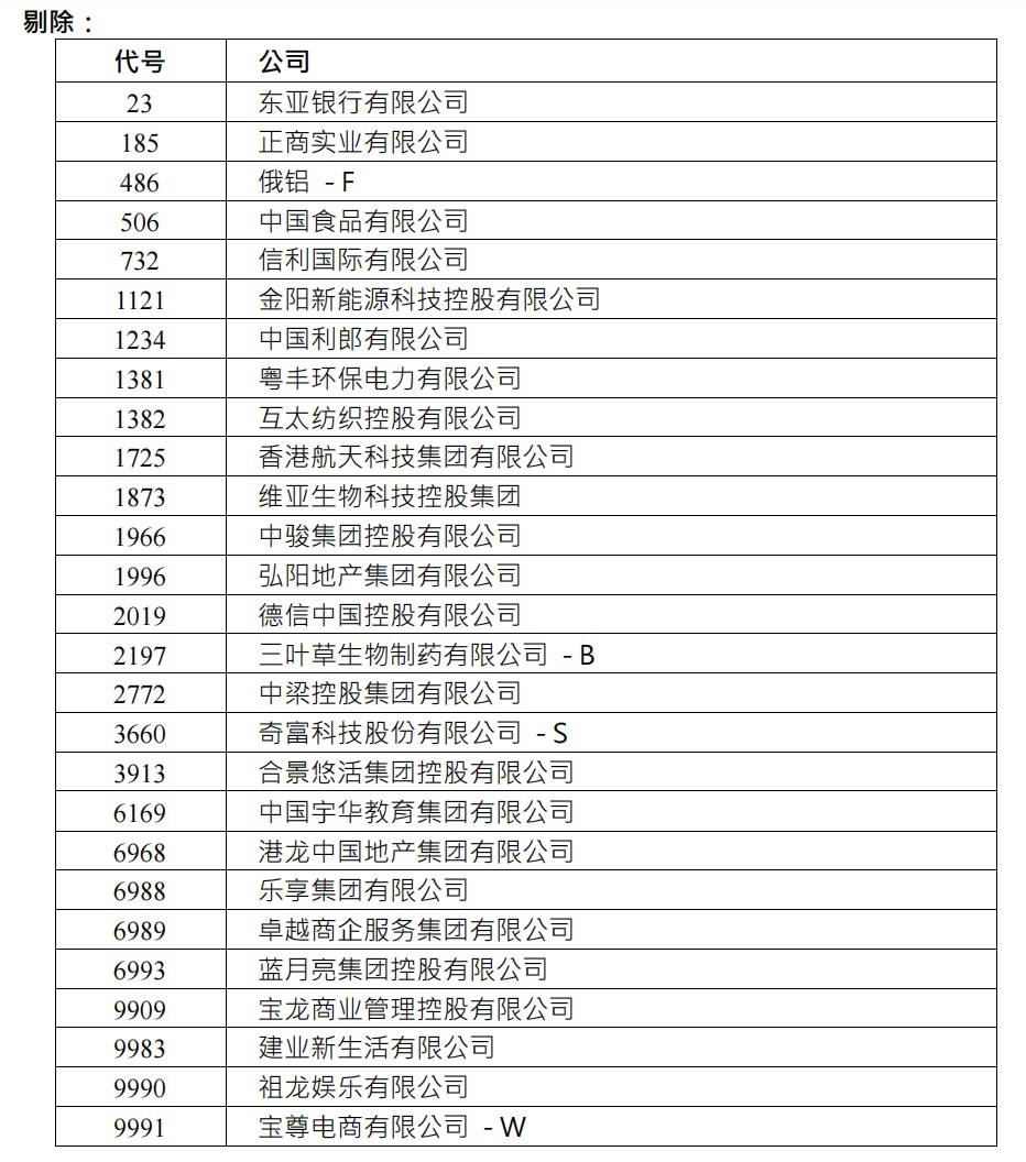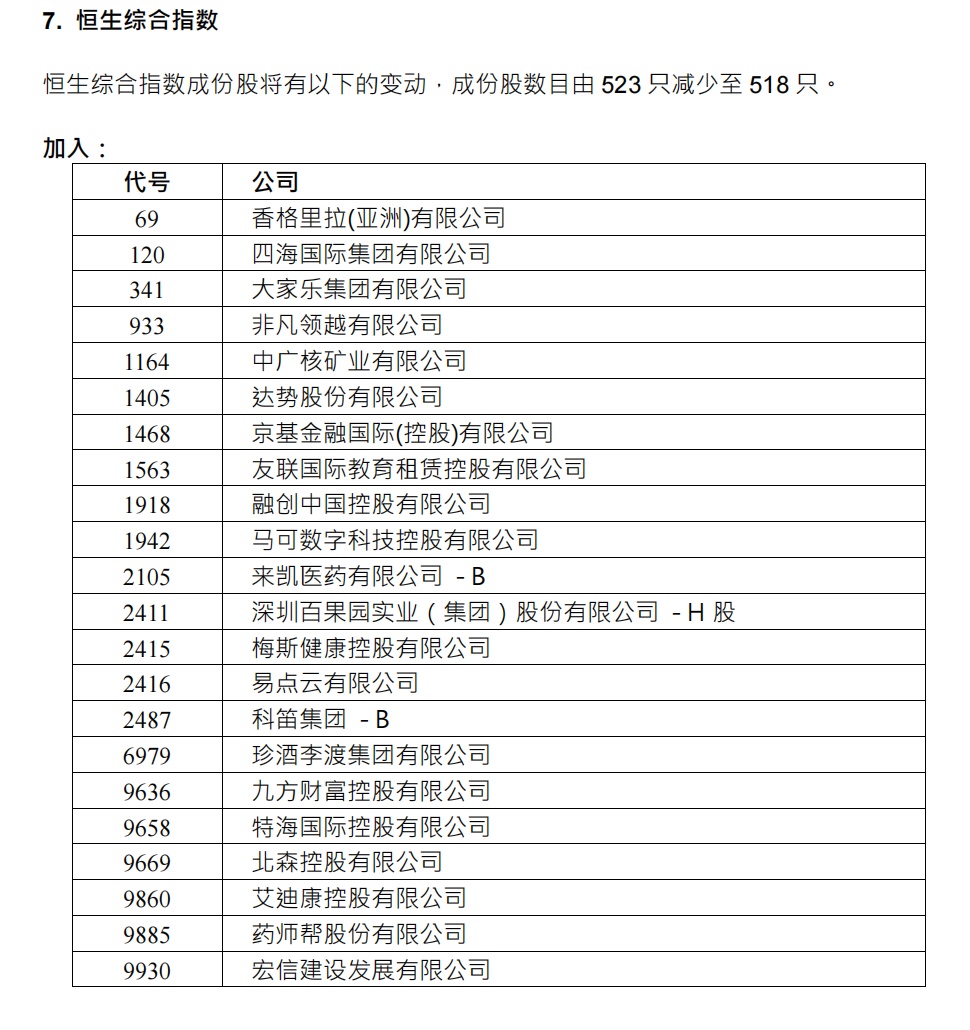 香格里拉(亚洲)(00069)等股将被纳入恒生综合指数成份股。成份股数目由523只减少至518只。