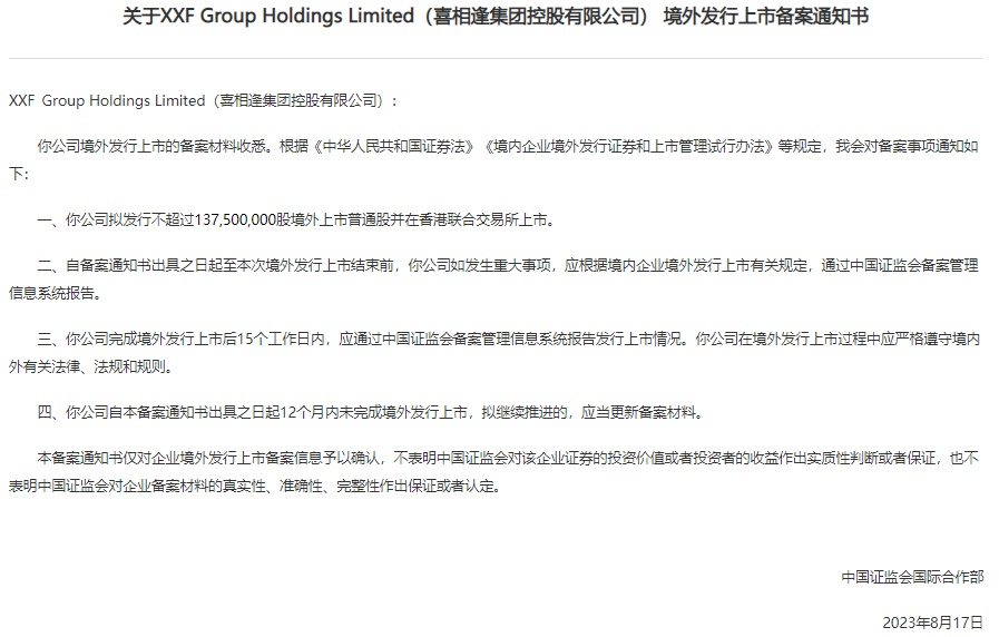 智通财经APP获悉,8月18日,中国证监会发布关于XXF Group Holdings