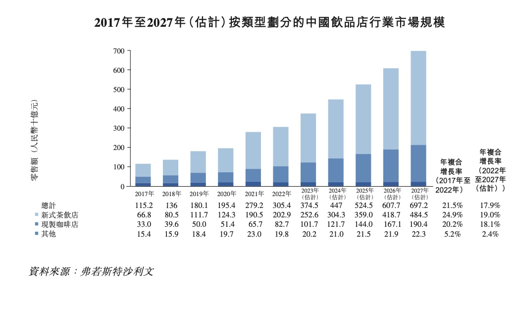 截至2023年8月8日,茶百道在全国共有7117家门店,遍布全国31个省市,已实现中国大陆所有省份及各线级城市的全覆盖。2022年,茶百道门店的零售额达到约133亿元(人民币,下同),2020年至2022年年复合增长率达139.7%。根据弗若斯特沙利文的报告,茶百道是中国前十大新式茶饮企业中增长最快的一家,在2020年至2022年间零售销售额年复合增长率最高。据弗若斯特沙利文,按2022年零售额计,茶百道在中国新式茶饮店市场中排名第三,市场份额达到6.6%。