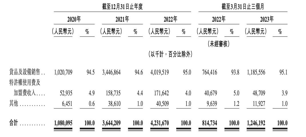 从收入来源分析,向加盟销售货品和设备是茶百道最主要的营收来源,2020年-2022年及2023年首三个月,来自该经营分部的营收来源分别为10.21亿元、34.47亿元、40.2亿元及11.86亿元,营收占比维持在95%左右。而特许权使用费及加盟费则是公司的第二大营收来源,报告期内来自该分部的营收占比在4%左右。