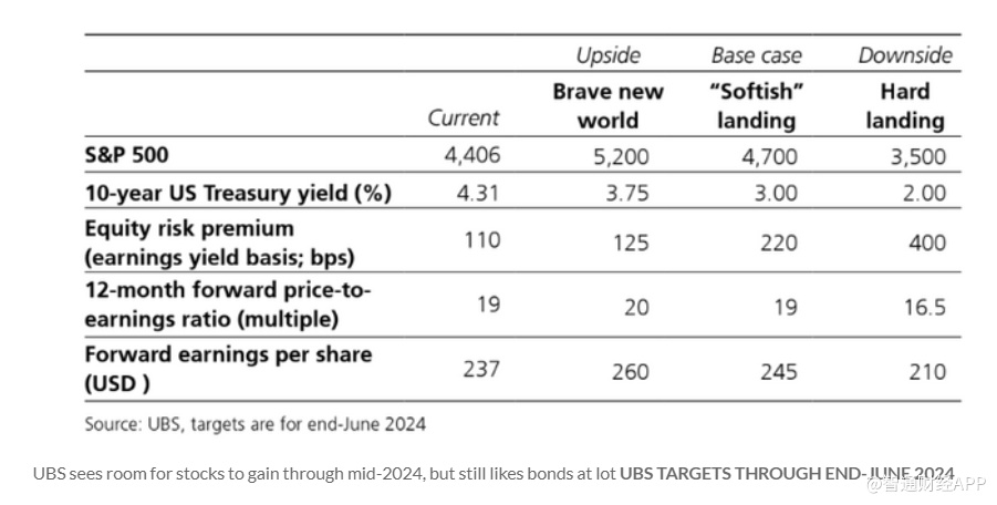 该资产管理公司现在为2024年6月底标普指数设定了4700点的目标,意味着从当前水平上看,总回报率为7%-8%。以下是该公司在不同经济情景下的最新预测。