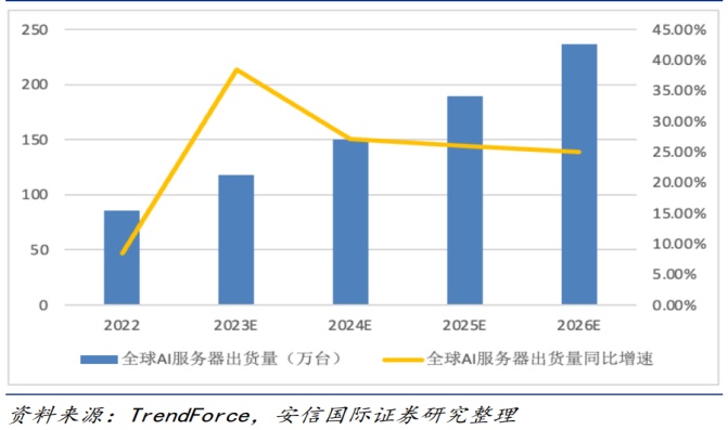 AI基于算力能力,而AI服务器的强大算力支持对于人工智能技术的发展和应用至关重要,据TrendForce 预测,2022 年全球 AI 服务器出货量将达到 85.5 万台,并在 2026 年达到 236.9万台,增速超过全球服务器出货量整体增长速度。根据IDC数据,2022年AI服务器的市场规模为183亿美元,近五年复合增速为16.6%。
