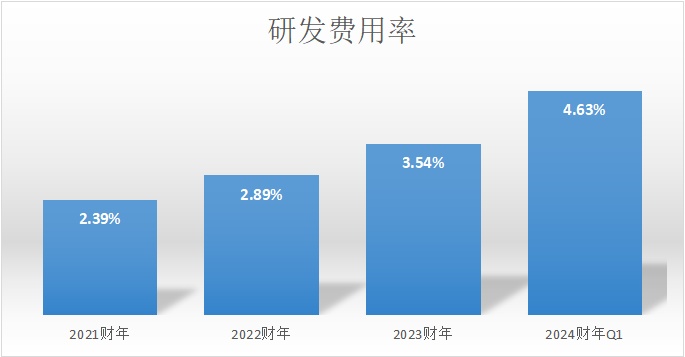 联想集团在AI领域具有夯实的研发基础,在2022财年就提出未来三年研发翻倍的计划,2019-2023财年,其研发费用复合增速达到14.75%,而研发费用率从2.48%提升至3.45%,2024财年Q1进一步提升至4.63%。较大的研发投入支持企业自主创新与产业链提升,为该公司长期发展打造坚实壁垒。