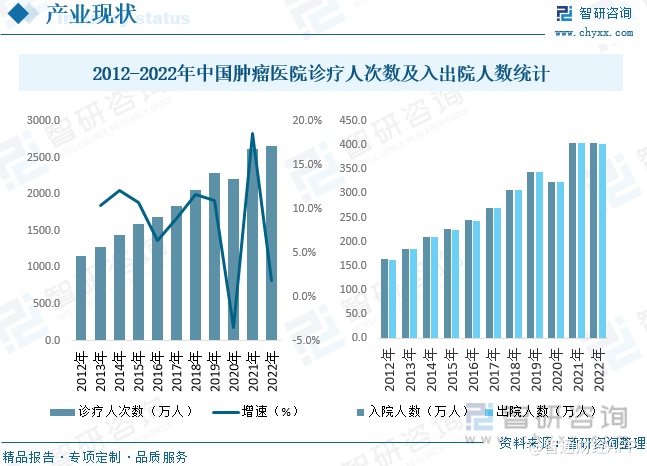 据智研咨询数据,从国内肿瘤医院下游就诊情况来看,因肿瘤疾病患病率通常随年龄增长而提高,随着近年来老龄化趋势加剧,预计肿瘤医院需求将持续扩大。2022年我国肿瘤医院就诊人次数约为2660.32万人,其中入院人数约为404.04万人,出院人数约为403.12万人,近十年来均保持较高的平均增速。