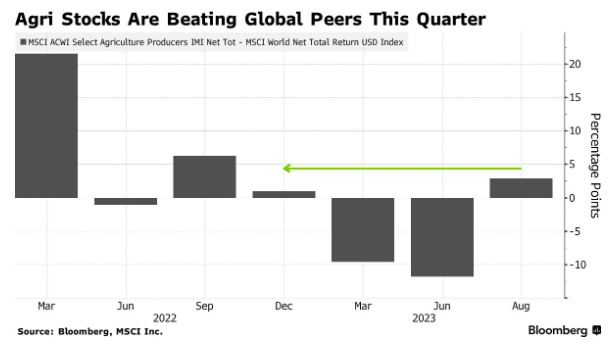 根据汇编数据显示,自7月初以来,一项追踪特定农业生产商总回报的指数的表现比更广泛的MCSI全球指数高出约3个百分点。食品行业表现优异,一项衡量食品大宗商品价格的指标上月创下16个月来最大涨幅。