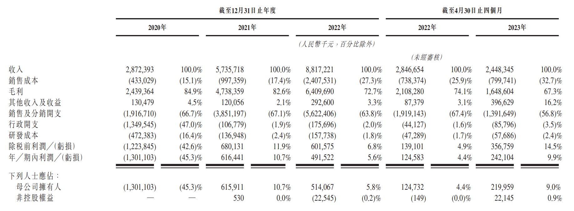 财务方面,于2020年度、2021年度以及2022年12月31日止,公司实现营业收入分别为人民币28.72亿元、57.36亿元、88.17亿元;同期,净利分别为人民币-13.01亿元、6.16亿元、4.92亿元。