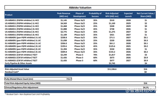 最后看赔率,由于早期产品存在研发失败的风险,根据产品的研发进度对每个产品进行风险评估,Leerink在研报中表示,若按15%的贴现率,按5X的估值计算,和誉当前的合理市值至少为115.37亿港元,即每股股价为16港元,较当前的市值有近10倍的收益,并给出OP(看涨)评级。