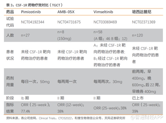 而培西达替尼III临床试验的ORR仅为39%,Vimseltinib的II期临床试验ORR仅为38%, AMB-05X的II期临床试验ORR也仅仅38%,不难看出Pimicotinib的疗效性远高于上述三款产品。