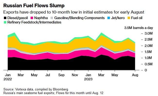 具体来看,柴油和汽油的出口量降至104万桶/日,较7月的平均水平下降11%;石脑油的出口量降至35.1万桶/日,为两个月以来低点;燃料油出口量降至68万桶/日,为2022年6月以来的最低水平。
