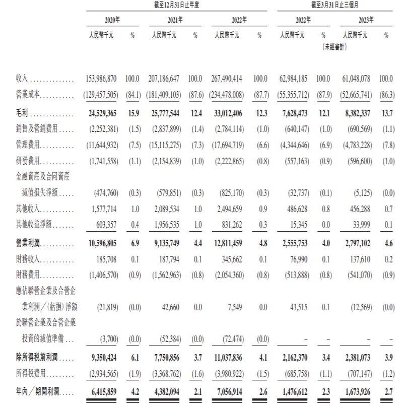 财务方面,于2020年度、2021年度、2022年度、2022年截至3月31日止三个月以及2023年截至3月31日止三个月,公司实现收入分别为人民币1539.87亿元、2071.87亿元、2674.90亿元、629.84亿元以及610.48亿元;期内利润分别约为人民币64.16亿元、43.82亿元、70.57亿元、14.77亿元以及16.74亿元。