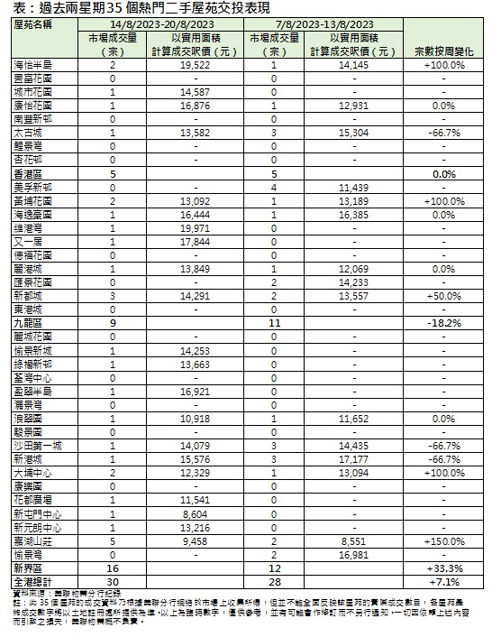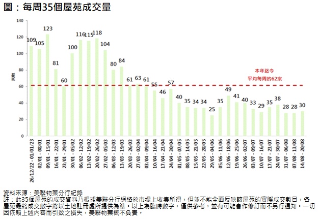 智通财经APP获悉,在新盘以低价抢占市场下,香港二手楼市交投继续淡静。综合香港美联分行资料,全港35个大型屋苑过去一周(8月14日至8月20日)合共录30宗成交,较前一周(8月7日至8月13日)的28宗环比回升约7.1%,近3周首次回升,但宗数仍然较年内平均数约62宗低超过5成。