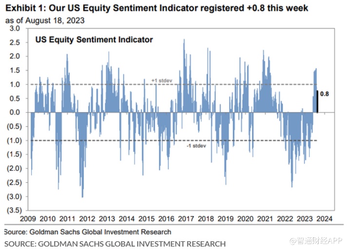 高盛的股票情绪指标反映了包括对冲基金的净敞口、外国投资者的净需求和主动及被动股票基金的资金流向在内的九个不同的定位指标。在8月18日结束的那周,该指标从12月的-1.8回升至上个月的1.5,但现已下降至0.8。
