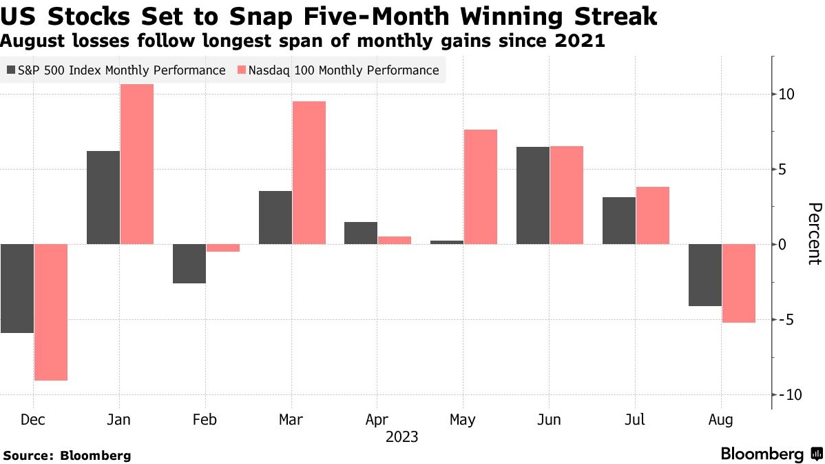 据了解,美国股市本月的回调结束了美股连续5个月的上涨,当时市场乐观地认为,美联储准备在不影响经济增长的情况下完成大举加息,导致股价强劲上涨。此外,对人工智能潜力的兴奋也推动了股市上涨,导致芯片制造商英伟达(NVDA.US)等科技股价格飙升。