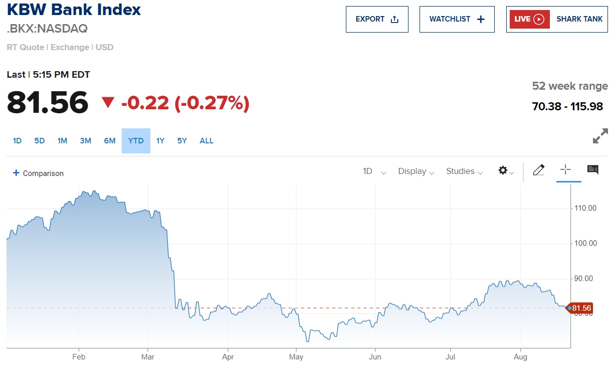 自穆迪下调一些银行的信用评级以来,衡量美国主要银行股价表现的KBW银行指数下跌了近7%,朝着自3月份美国三家地区性银行倒闭浪潮引发大规模抛售以来,该指数最糟糕的月度表现奔去。