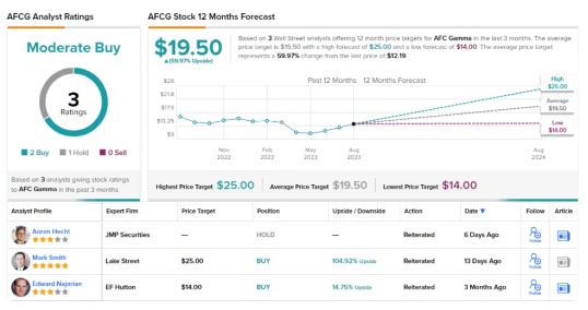 总体而言,基于2位分析师的“买入”评级和1位的“持有”,华尔街对AFC Gamma的一致评级为“中等买入”。平均目标价为19.50美元,意味着未来一年有约60%的涨幅,加上股息率,该股的总回报潜力可能接近75%。