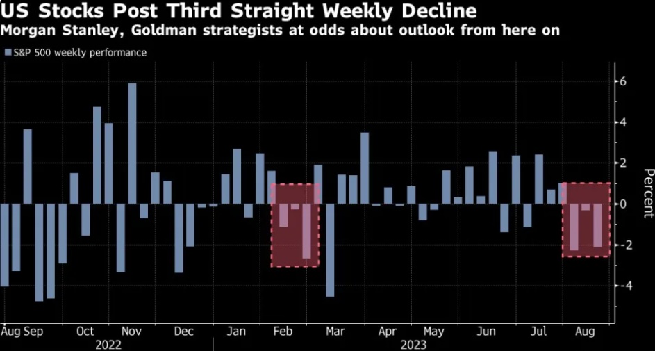 上周,美国股市连续第三周下跌,这是自2月份以来最长的连续下跌,因为经济复苏的迹象支持了美联储将在更长时间内保持高利率的押注。美联储政策前景的下一个线索将于本周晚些时候出现,届时美联储主席鲍威尔将在杰克逊霍尔年度央行研讨会上发表讲话。