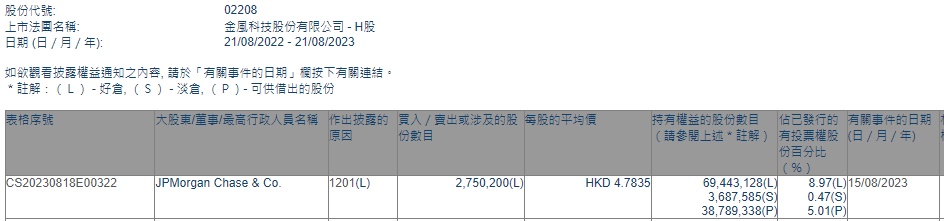 智通财经APP获悉,香港联交所最新资料显示,8月15日,小摩减持金风科技(02208)275.02万股,每股作价4.7835港元,总金额约为1315.56万港元。减持后最新持股数目约为6944.31万股,最新持股比例为8.97%。