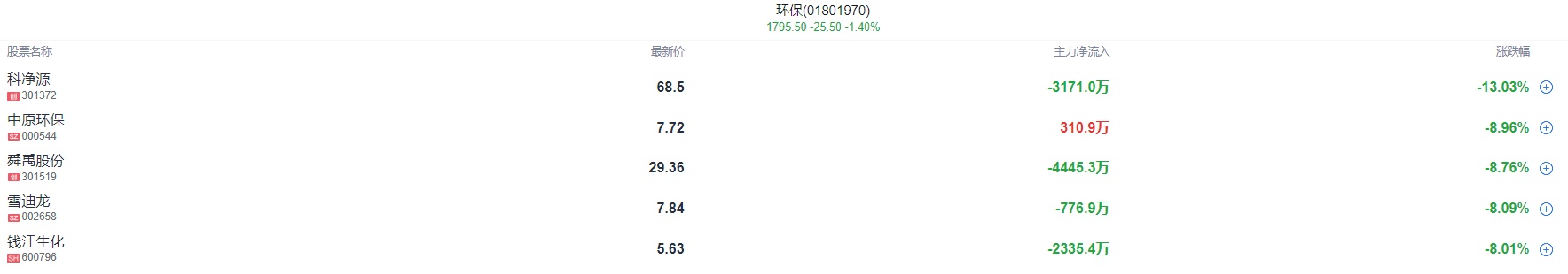 昨日大涨的环保股今日跌幅居前,科净源跌超13%,中原环保、九州一轨、中兰环保等跌幅居前。