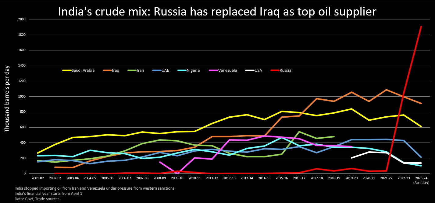 不过,俄罗斯仍是印度在7月份最大的原油供应国,其次是伊拉克和沙特。数据显示,尽管印度从沙特进口的原油有所减少,但由于从伊拉克、阿联酋和尼日利亚进口的原油增加,印度在7月份从OPEC进口的原油所占份额升至3月份以来的最高水平。