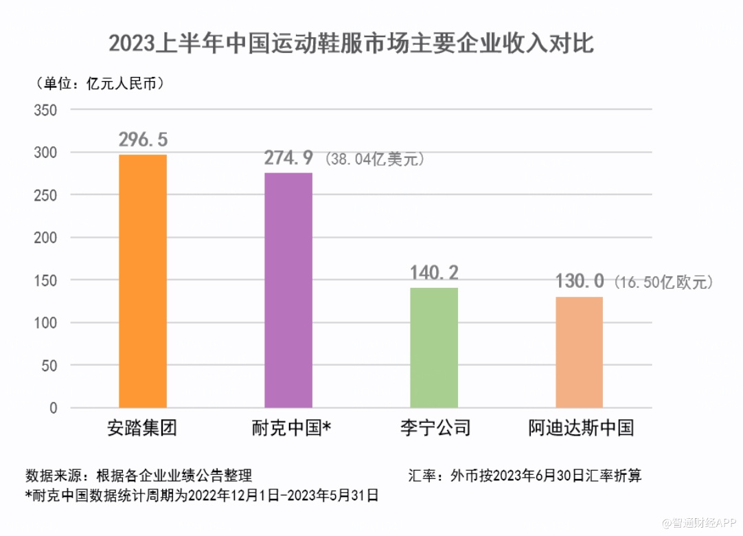 横向对比来看,安踏体育营收在中国运动鞋服市场持续领先。上半年,集团营收超过李宁和阿迪达斯中国总和。对比耐克中国截至2023年5月31日6个月的营收数据,安踏体育继续保持对后者领先优势。这意味着,从2022财年开始形成的安踏+耐克领衔中国运动鞋服市场的“双巨头”格局已趋于稳定。