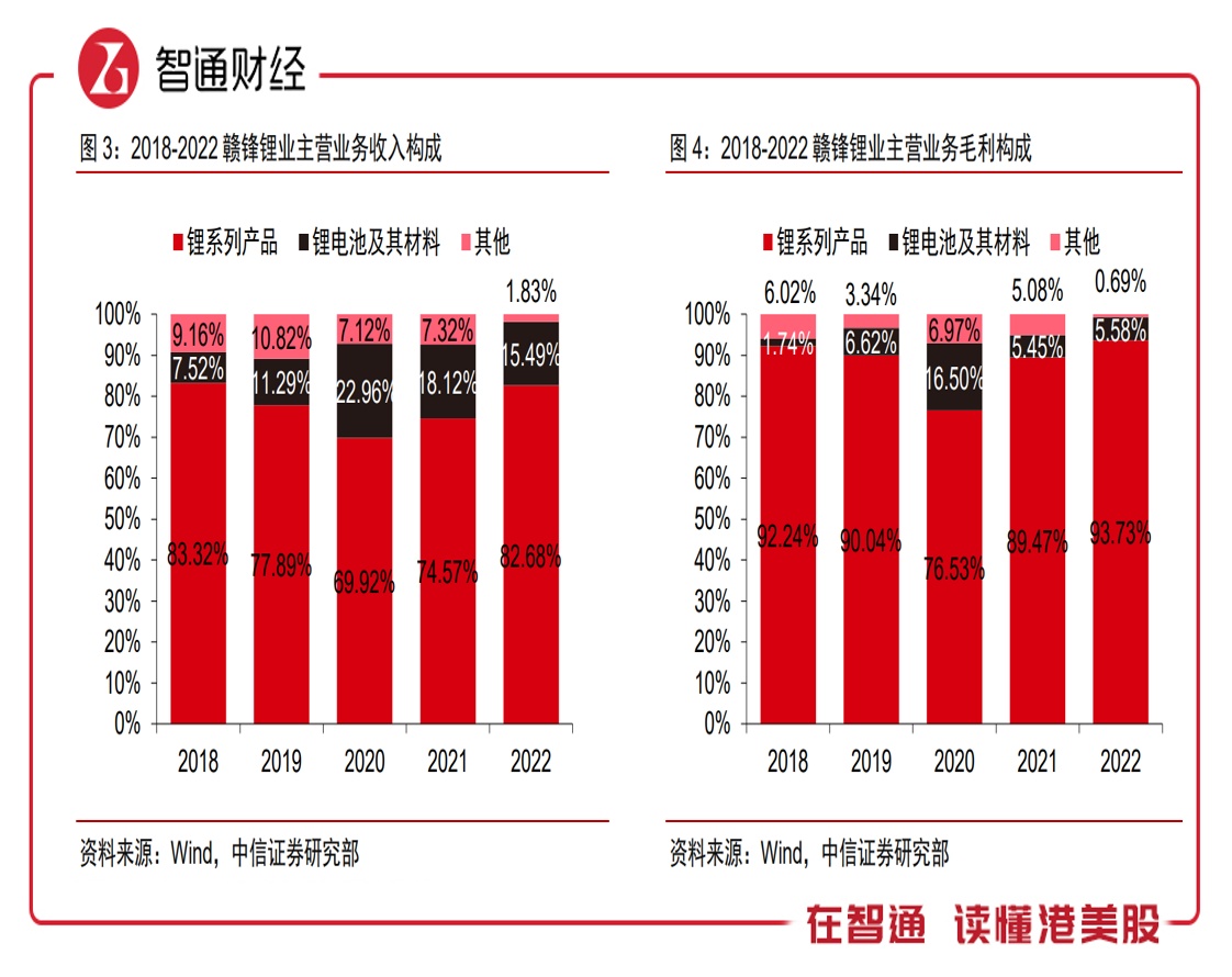 智通财经APP了解到,赣锋锂业是锂电产业链龙头,布局了锂电上游锂矿资源,中游材料,包括金属锂以及锂电化合物等,以及也布局了终端电池产品,从结构上看,上游主要为资源内供,基本不贡献业绩,中游占收入比重最大,超过八成,而下游产品近几年才发力,业绩贡献较低,不过动力电池行业对公司业绩影响最大。