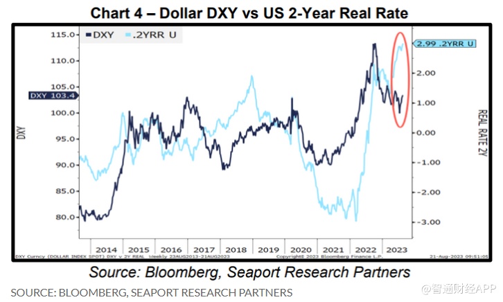 与此同时,实际利率,即基于10年期美债与通货膨胀保护证券(TIPS)的收益率,交易在2%左右,这是自2009年以来的最高水平。