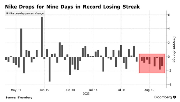 数据显示,耐克股价周二下跌1.4%,至101.46美元,连续第九个交易日下跌,这是该公司自1980年12月IPO以来的最长连跌记录。早前,耐克的客户、零售商迪克体育用品(DKS.US)公布了一份不及预期的第二财季业绩,并下调了今年的利润预期,部分原因该公司门店盗窃事件增多。