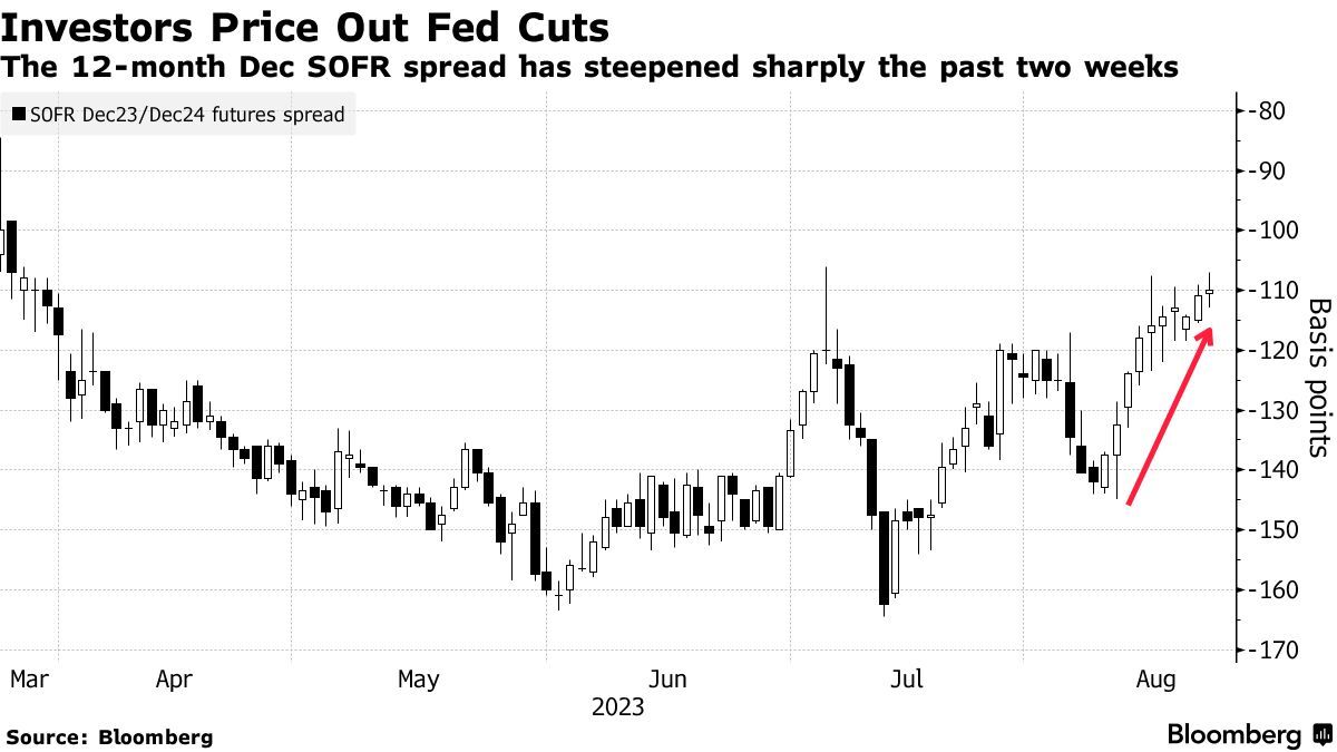 在周一,有着“全球资产定价之锚”之称的10年期美国国债收益率盘中升破4.35%,创2007年11月以来新高,其实很大程度上暗示市场的降息押注逐渐退场,取而代之的是利率将长期维持在高位的预期。在与有担保隔夜融资利率(SOFR)挂钩的期权中,过去一周非常流行的一种交易模式是对冲与基准利率将在明年持续高位运作有关的风险。