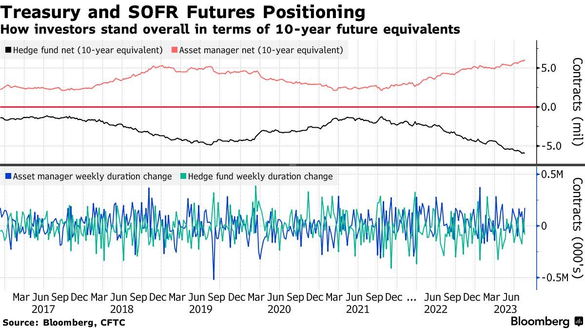 美国商品期货交易委员会(CFTC)截至8月15日的数据显示,资产管理公司增加了SOFR期货的净空头头寸,而对冲基金则增加了净多头头寸。进一步看,随着收益率不断走高,资产管理公司增加净长期存续期,而对冲基金看跌,表明押注未来的美债抛售浪潮还有更大空间。
