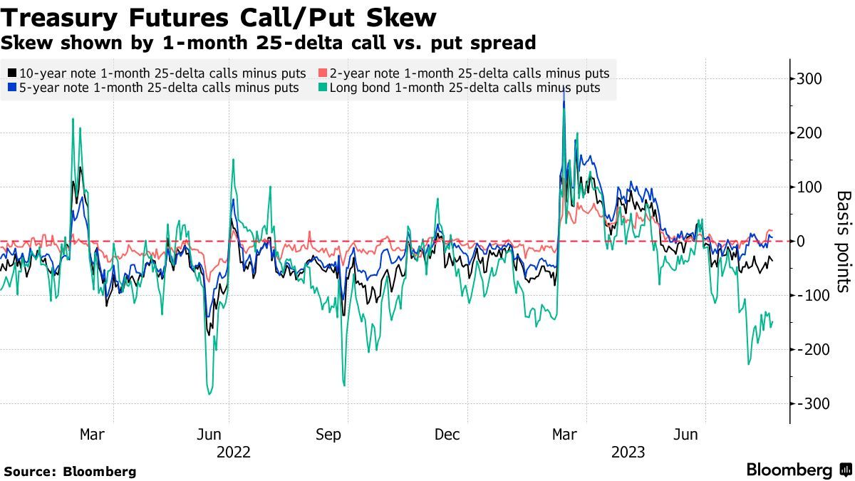 过去几周,随着交易员缩减对明年降息的预期,与SOFR挂钩的12个月期债Dec23/Dec24价差大幅收窄。SOFR期权中也出现了类似的情绪,交易员们瞄准明年及以后的下行趋势保护,与此同时他们建立的看涨头寸将因更多的降息押注被挤出市场而获利。
