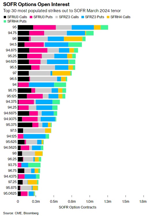 SOFR期权方面。到2024年3月为止,最活跃的SOFR期权仍然是95.00,最近在该水平附近的活跃交易包括94.875/95.00/95.125/95.25鹰式期权看涨组合。此外,SOFR期权最近的一个明显的主题交易是购买2024年和2025年的下行保护期权。