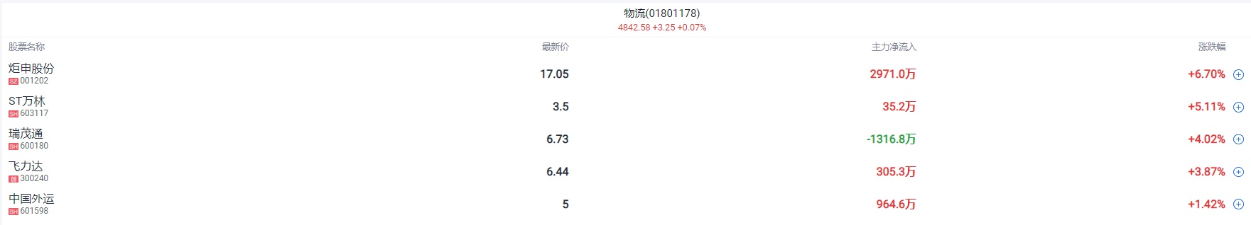 物流概念震荡冲高,炬申股份涨停,飞力达、瑞茂通、圆通速递、三羊马等纷纷跟涨。