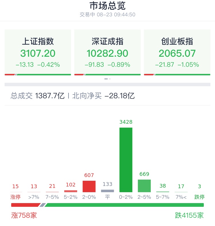 今日A股三大指数集体低开,随后震荡走弱,截至9:45,沪指跌0.42%,深成指跌0.89%,创业板指跌1.05%。