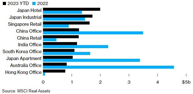 根据MSCI Real Assets的数据,到目前为止,2023年外国投资者在日本的酒店交易上花费了20亿美元,是亚洲商业地产领域花费最多的,并且这已经超过了2022年全年的14亿美元。