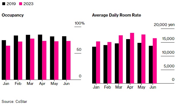这些因素表明,日本酒店业还有更大的扩张空间。根据房地产数据提供商CoStar的数据,日本的游客数量和酒店入住率仍低于2019年的水平,但今年上半年的平均每日房价平均比2019年上半年高出16%。