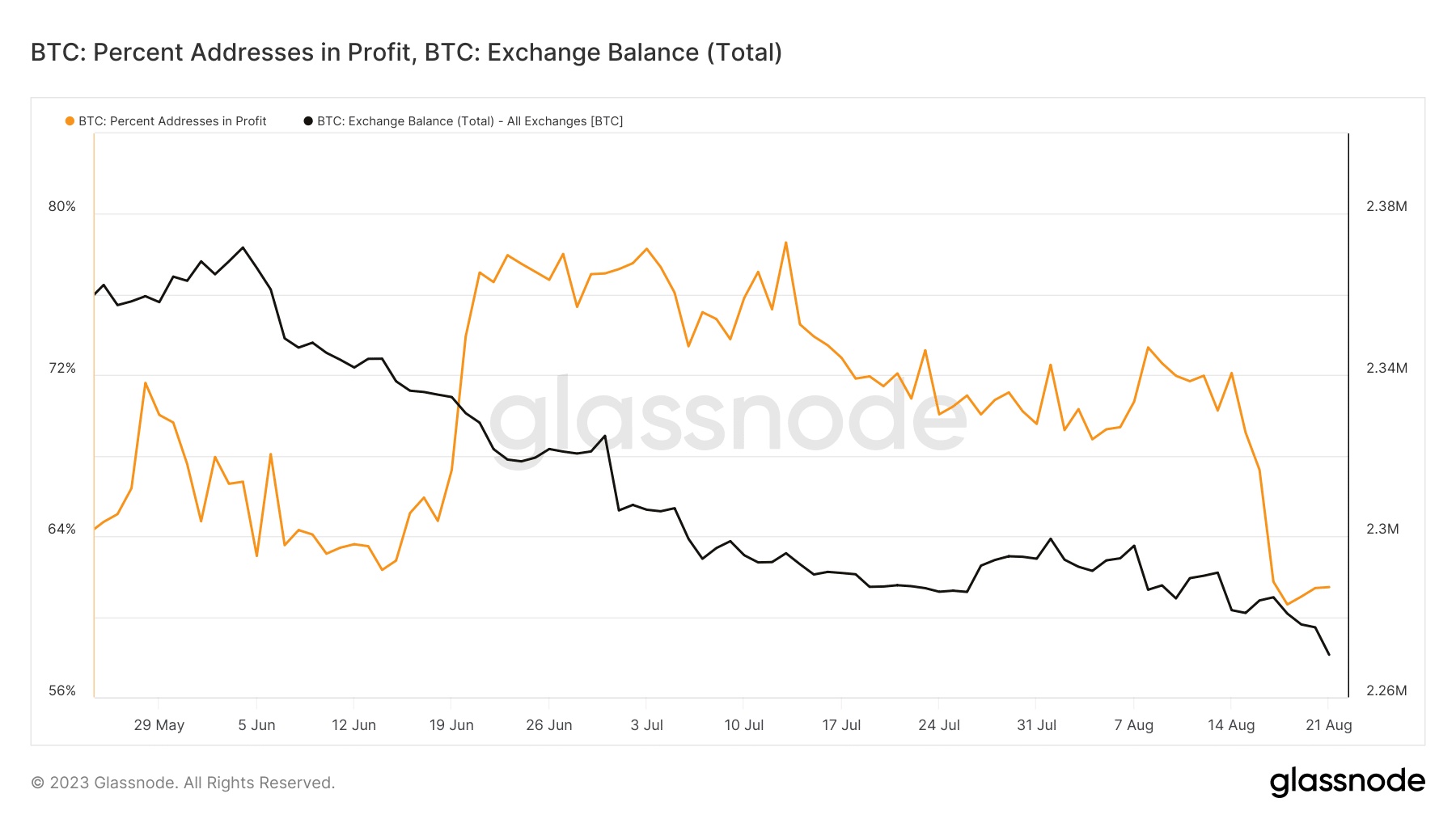 比特币盈利地址的比例和交易余额中的百分比