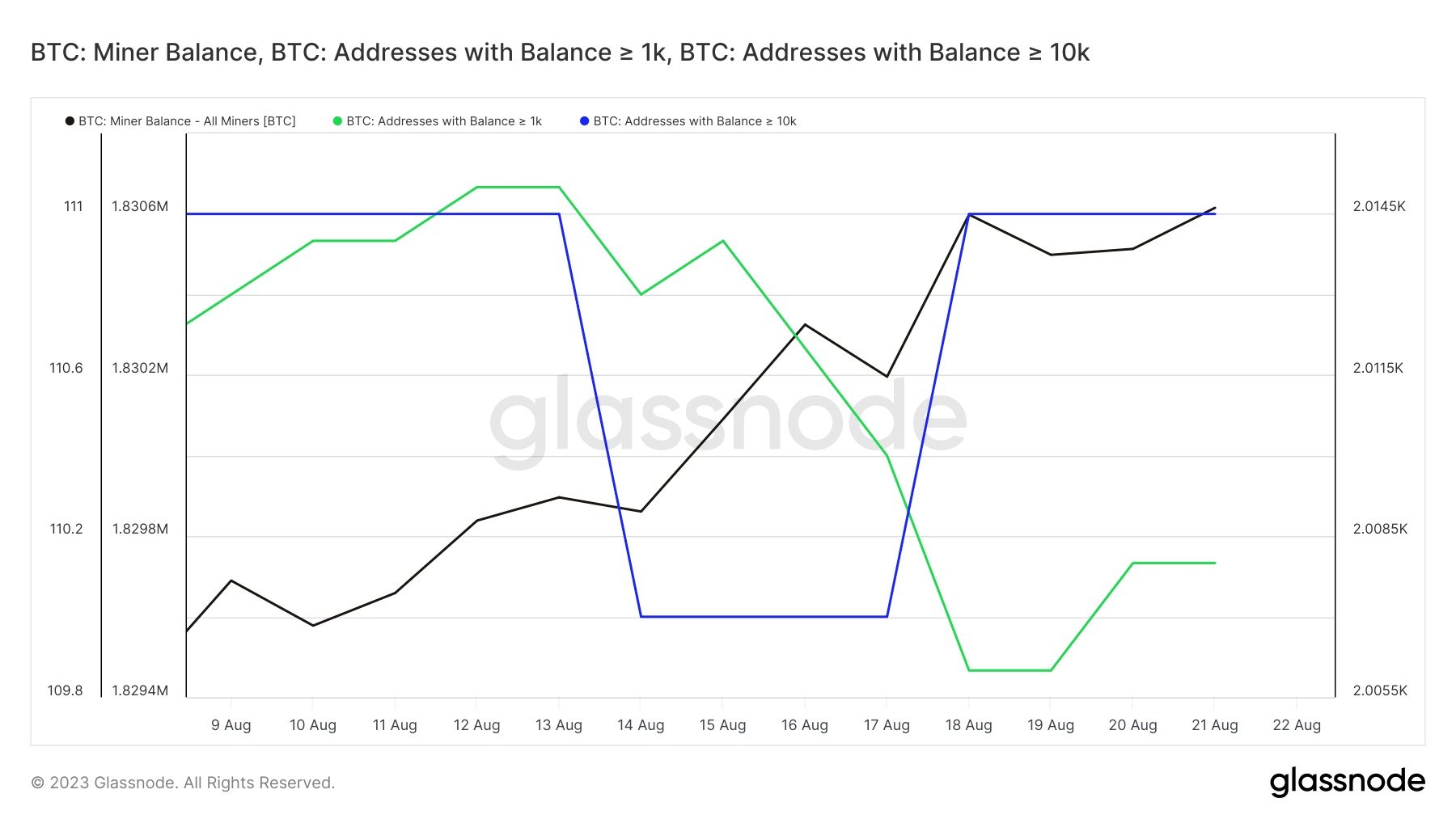 通过一些加密货币链条上的数据报告,这些发现表明未来几天可能会有一些看涨的尝试。挖矿企业的余额一直在上升,这意味着比特币矿企选择持有比特币,因为他们预计比特币价格会继续上涨。这也意味着,情况还没有糟糕到需要投降式抛售的地步。自8月19日以来,持有超过1,000 比特币(绿色表示)的那些“比特币大鲸鱼”逐渐重新积累。
