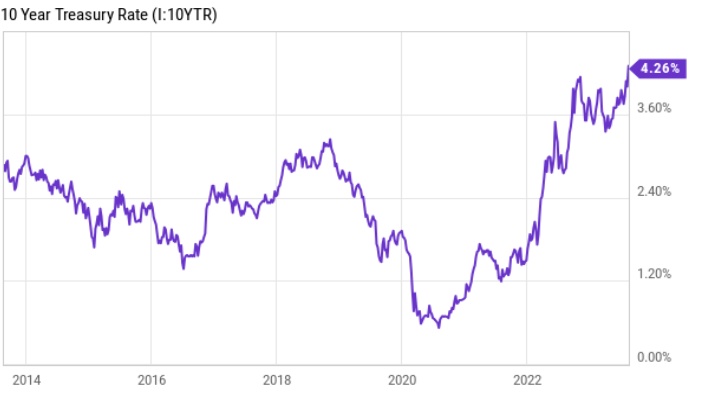 美债利率上升现在已经变成了“驶近的货运列车的轰鸣声”。最近,10年期国债收益率继续上升,本周超过4.3%,创下52周新高,而且一度达到4.37%,为自2007年以来新高。30年期固定利率抵押贷款本周达到7.48%,现在有可能上升到8%以上。在美联储实行了十多年的零利率政策之后,飙升通胀带来的高利率似乎正在酝酿一场经济雪崩,有可能使我们所知的经济和市场发生天翻地覆的变化。