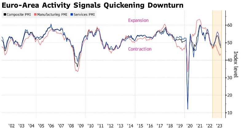 随着制造业部门持续衰退,而服务业不再是经济的亮点,欧元区经济活动收缩加剧。与此同时,欧元区最大的两个经济体的PMI数据也逊于预期,促使市场押注欧洲央行下个月将暂停加息,并有经济学家警告称,欧元区本季度的经济产出将萎缩。