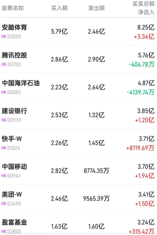 安踏体育(02020)获净买入1.74亿港元。消息面上,安踏体育发布中期业绩,收益296.45亿元人民币,同比增长14.2%;股东应占溢利47.48亿元,同比增长32.3%。整体毛利率达历年最高水平,上升1.3个百分点至63.3%。管理层维持安踏品牌及Fila今年销售增长指引各介乎10%至20%,并将其他品牌包括Descente及Kolon增长指引由30%上调至40%。