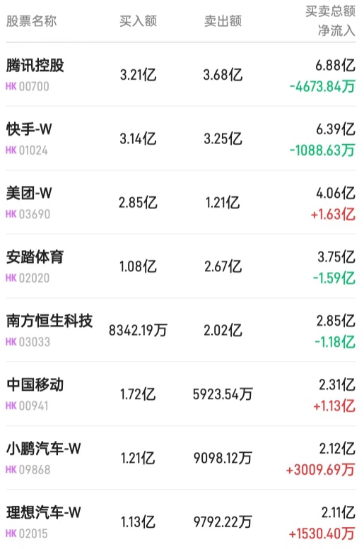 北水净买入最多的个股是美团-W(03690)、中国移动(00941)、药明生物(02269)。北水净卖出最多的个股是南方恒生科技(03033)、腾讯(00700)、中海油(00883)。