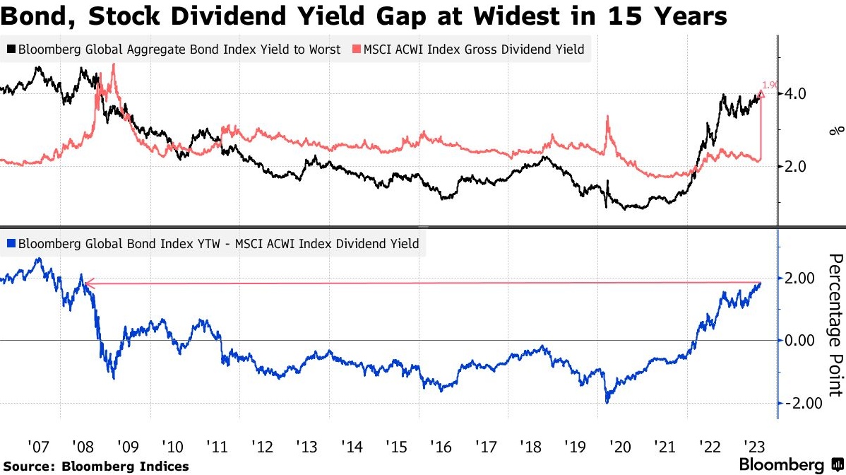 智通财经APP获悉,全球利率在更长时间内保持在较高水平的前景,正促使许多投资者从股票转向债券。根据数据显示,固定收益比股票的股息回报高出180个基点。这是15年来最大的差距,而且随着交易员押注低利率时代已经结束,这一差距可能会持续甚至扩大。