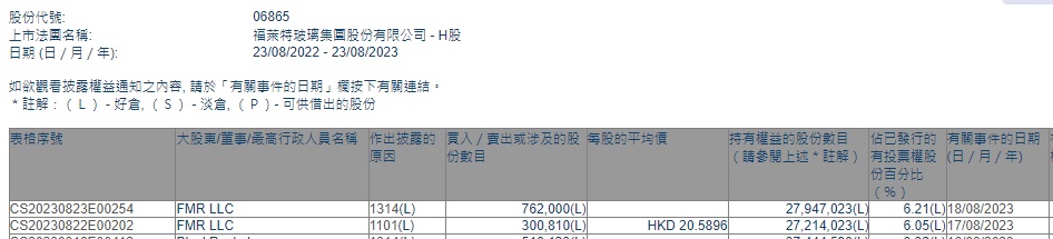 智通财经APP获悉,香港联交所最新资料显示,8月17日,FMR LLC增持福莱特玻璃(06865)30.0810万股,每股作价20.5896港元,总金额约为619.36万港元。增持后最新持股数目约为2721.40万股,最新持股比例为6.05%。