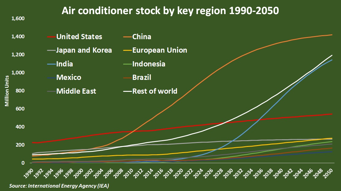 IEA的数据显示,到2030年,欧盟国家的空调库存预计将在当前水平上增长28%,印度的空调库存将增长200%以上。IEA还预计,未来几十年,印尼、日本、韩国和其他地区的空调使用量将进一步快速增长。