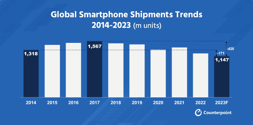 Research的最新全球智能手机出货量初步数据预测,2023年全球智能手机出货量将下降6%,达11.5亿台,创过去十年来的最低水平。亚洲市场的下滑是实现正增长面临的主要障碍之一。此外,北美市场仍然是影响全球智能手机市场的主要因素,令人失望的上半年表现导致全年出货量出现了两位数的下降。