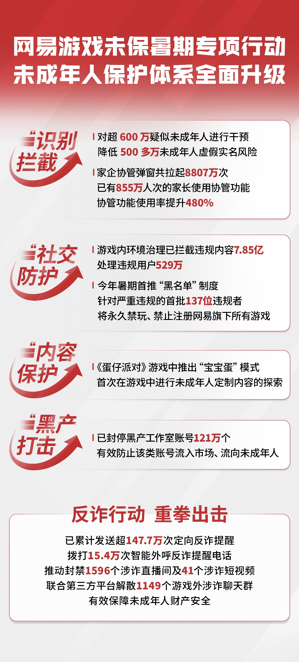 二季度末,网易连续第三年启动暑期未成年人保护专项,行业首推多项未成年保护创新举措,织密防护网。针对部分未成年人冒用成年人身份绕过防沉迷监管的情况,首次推出24小时巡航的AI巡逻员,以技术手段提升未成年行为识别精准度,强化不良信息的过滤及拦截效率,切实保障未成年暑期上网安全。暑期以来,AI巡逻员已降低500多万未成年人虚假实名风险。针对适龄内容推荐,在《蛋仔派对》游戏中推出“宝宝蛋”模式,首次在游戏中进行未成年人定制内容的探索,结合未成年人教育需求,为未成年人定制专属内容池。