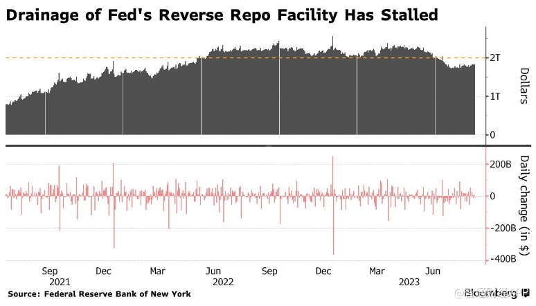 这种风险并非纯理论,美联储ON RRP机制的下降似乎已经停滞。而银行准备金稀缺在过去也曾引发过问题,最明显的是在2019年9月,当时财政部增加了借贷,美联储停止为其资产负债表购买更多的国债。