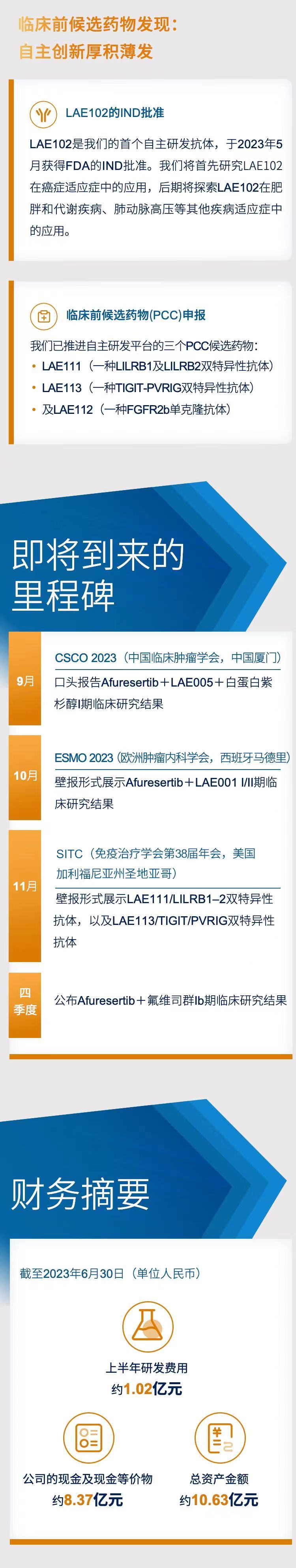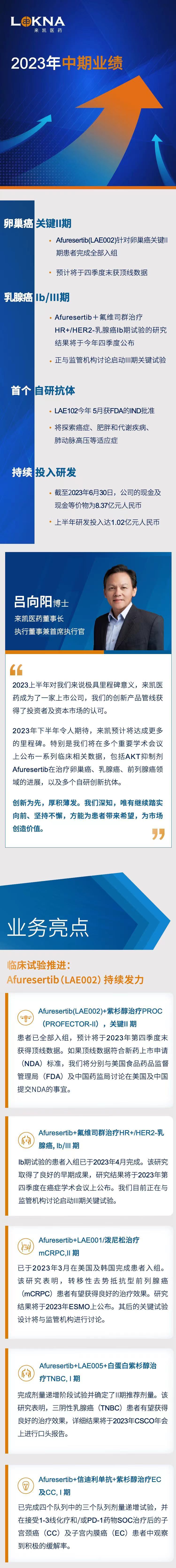 智通财经APP获悉,来凯医药-B(02105)公布2023年中期业绩,其他收入为324.3万元人民币(单位下同),同比增长11.47倍;研发费用约1.02亿元。该公司在公告中表示,公司已针对Afuresertib(LAE002)、LAE001及LAE005启动六项临床试验,包括一项关键试验,以解决癌症领域未被满足的医疗需求。于该六项临床试验中,三项是国际多中心临床试验(MRCT)。于2023年上半年,公司在药物管线及业务营运方面取得重大进展。
