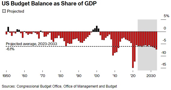 其结果是,无党派的国会预算办公室预计今年赤字将扩大到GDP的6%左右,未来10年也将保持在这个水平。作为背景,从二战结束到2008年金融危机之间的60年左右的时间里,赤字从未达到这一水平。